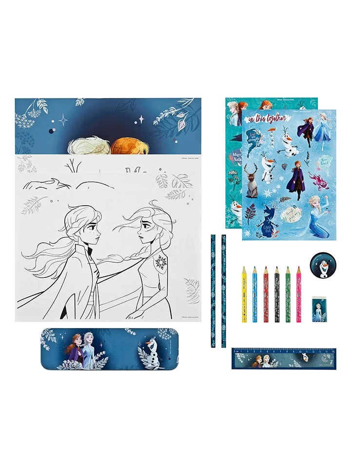 – Inhalt: 1 Tasche mit Griff und Reißverschluss, 1 Metalldose, 6 Poster, 2 Stickerblätter, 2 Bleistifte, 5 Mini Buntstifte, Notizblock, Lineal, Spitzer, Radierer